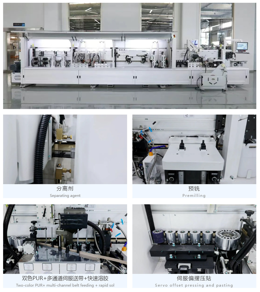 The servo-regulated pressure beam structure enables precise control, allowing for rapid adjustment of edge banding for plates of different thicknesses.