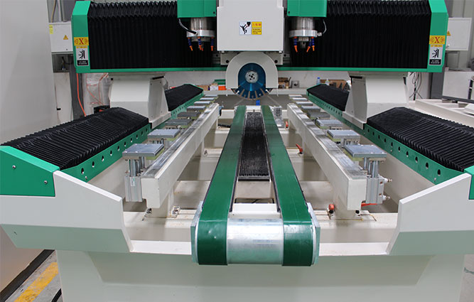 2、 傳送帶自動輸送至適合加工的位置(后側(cè)紅外線為基準),側(cè)推矯正板材自動定位,自動裝夾。無須對原點,只須確定盆孔的位置,開始加工。即:鋸片開孔(方孔),左右兩側(cè)主軸一個修角,一個精磨。